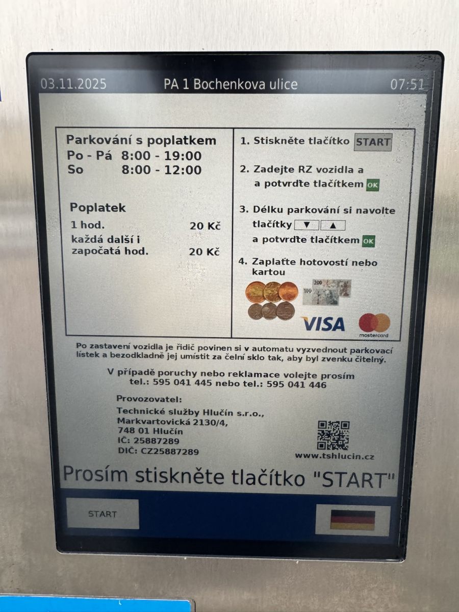 Informujeme návštěvníky parkoviště Bochenkova v Hlučíně o instalaci nového parkovacího automatu. Tento automat je opatřen velkoplošným dotykovým displejem, stejně jako na ostatních parkovištích v Hlučíně, je nutné v prvním kroku zadat registrační značku vozidla, které zde parkuje. Ovládání automatu je zcela jednoduché na „4 kroky“, návod na obsluhu je obsažen na vstupní obrazovce displeje a na informační tabulce pod displejem. I zde lze platit v hotovosti, ale i bezhotovostně platební kartou. Stejný princip ovládání automatu bude zaveden do konce roku i u automatů v Hlučíně na Mírovém Náměstí.